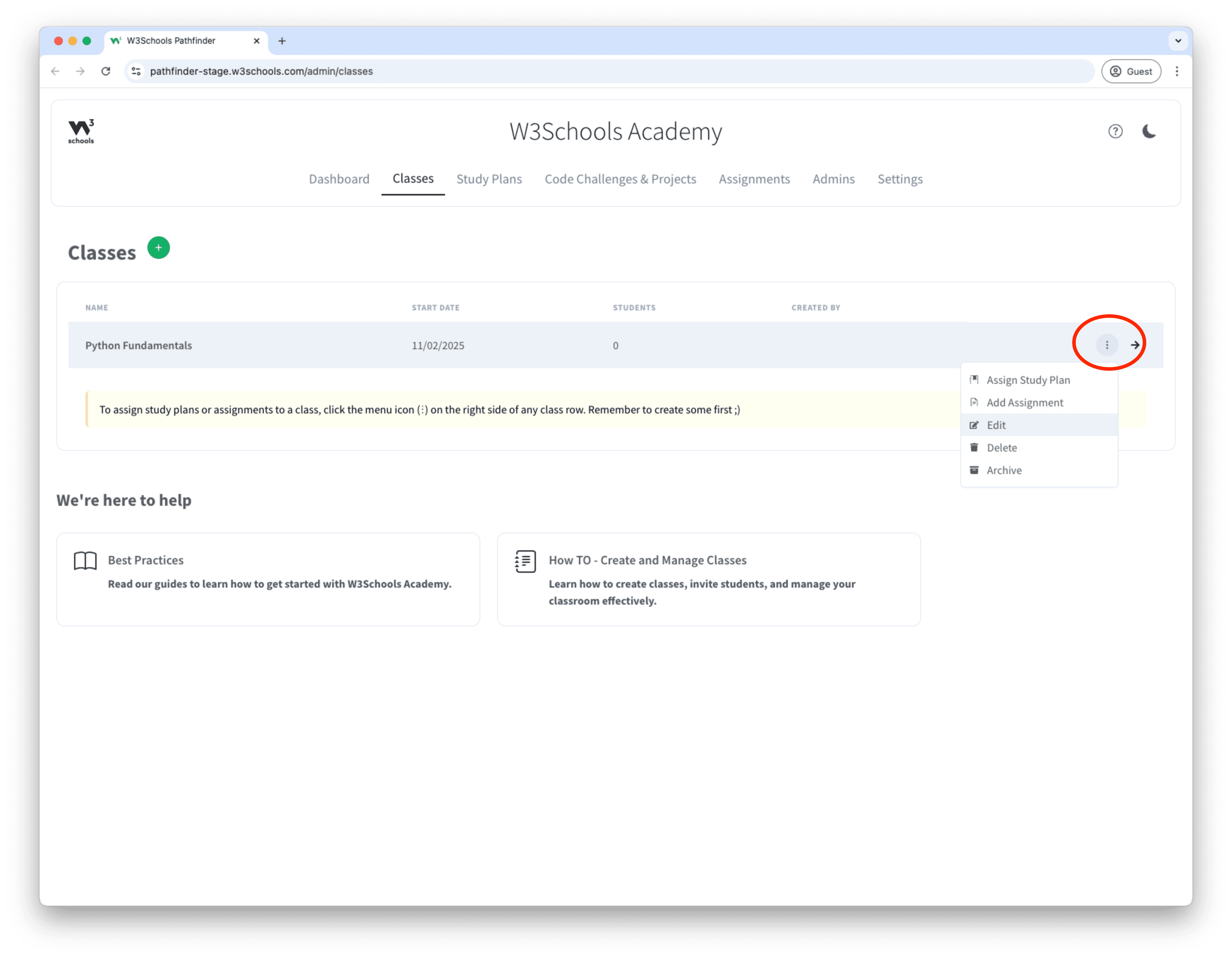 To edit details, click on the hamburger menu to the right of your class and click "Edit" in the dropdown menu.