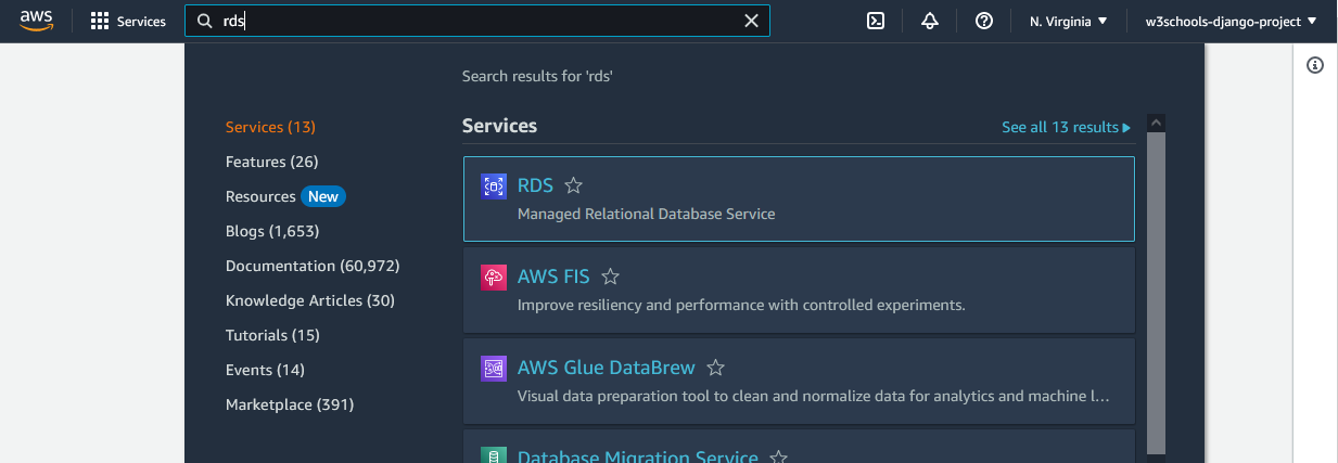 In the search field, search for "RDS", and click to start the service: