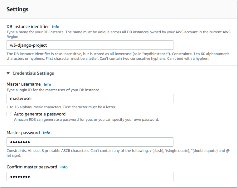 Name of database, username, and password