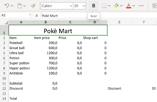 Type Poke Mart in the merged range A1:D1