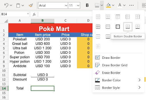 B11: UnderlineB14: Double bottom borderE12:F12: Thick outside borders
