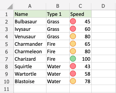 Add icons to the Speed values of each Pokemon with Icon Set conditional formatting.