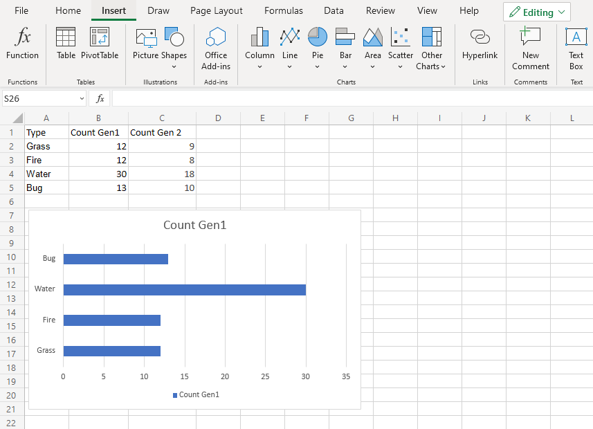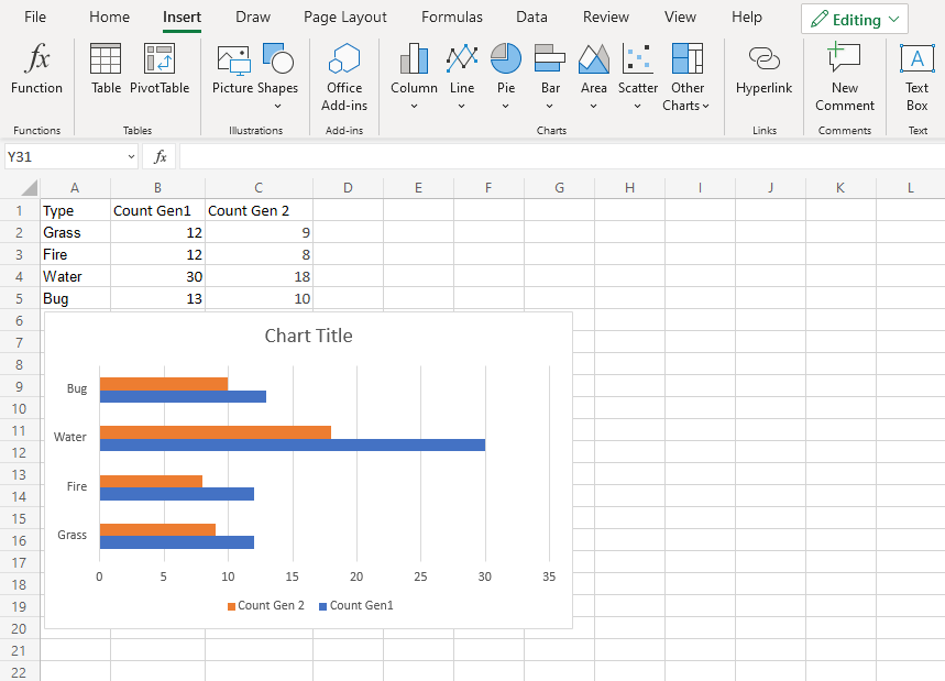 1. Click on the insert menu, then click on the bar menu () and choose Clustered Bar () from the drop-down menu