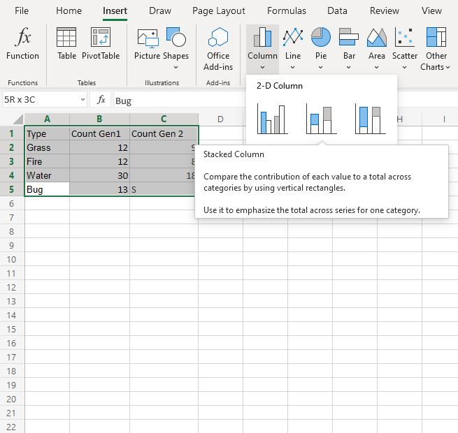 1. Click on the insert menu, then click on the column menu () and choose Clustered Column () from the drop-down menu
