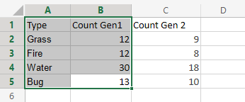 The chart gives a visual overview of the number of 1st and 2nd generation Grass, Fire, Water and Bug type Pokemon.