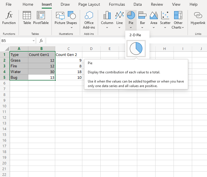 1. Click on the Insert menu, then click on the Pie menu () and choose Pie () from the drop-down menu