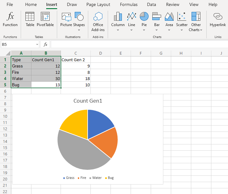 The chart gives a visual overview of the number of 1st generation Grass, Fire, Water and Bug type Pokemon.