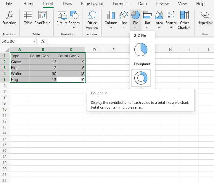 1. Click on the Insert menu, then click on the Pie menu () and choose Doughnut () from the drop-down menu