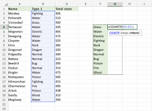 Apply the COUNTIF function to range B2:B21, to count how many Pokemons we have in the different types: