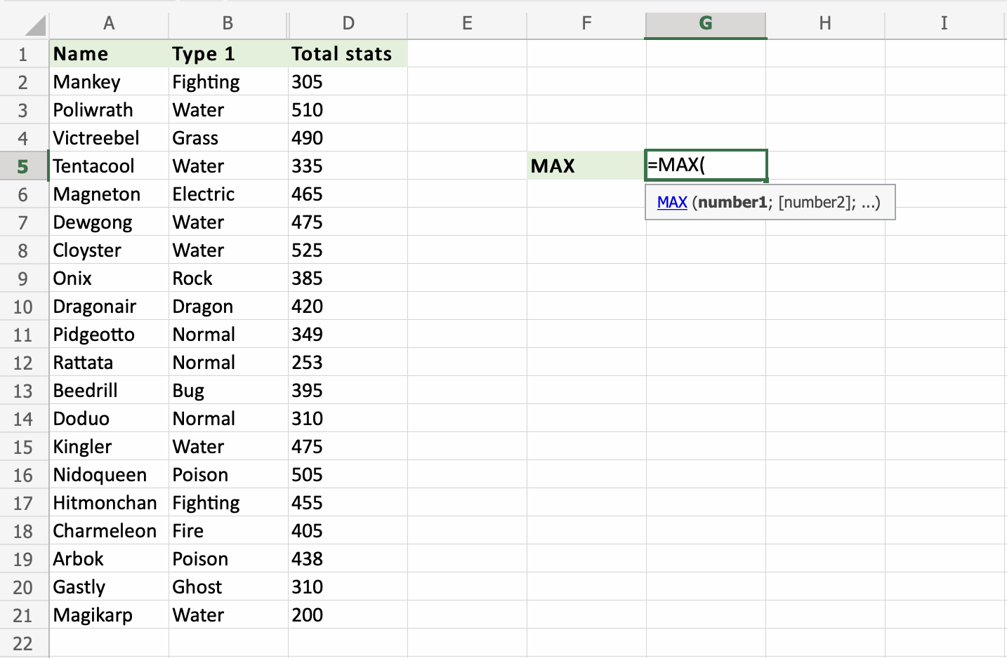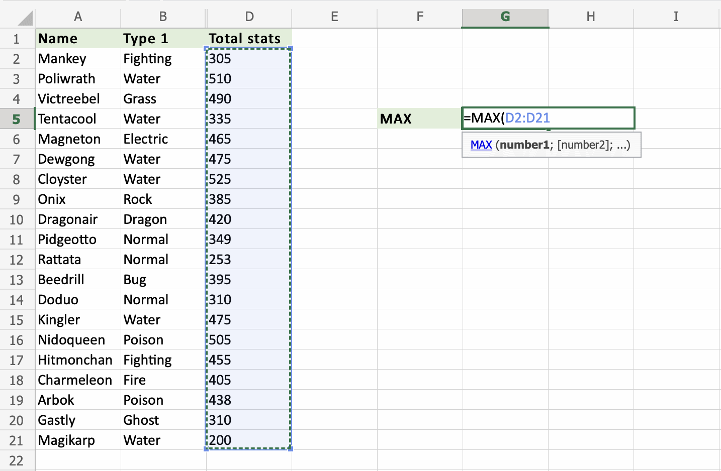 Nice going. The function ignores the text typed in the range. 510 is returned as the new highest value, since the old one was replaced with text. Poliwrath is now the Pokemon with the highest Total stats in the range D2:D21.