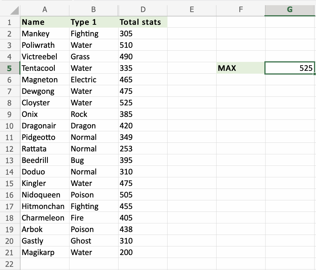 That's great! The function has successfully found the highest value, 525. Cloyster has the highest Total stats of the Pokemons in the range D2:D21.