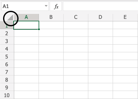 The entire spreadsheet can be selected by clicking the triangle in the top-left corner of the spreadsheet: