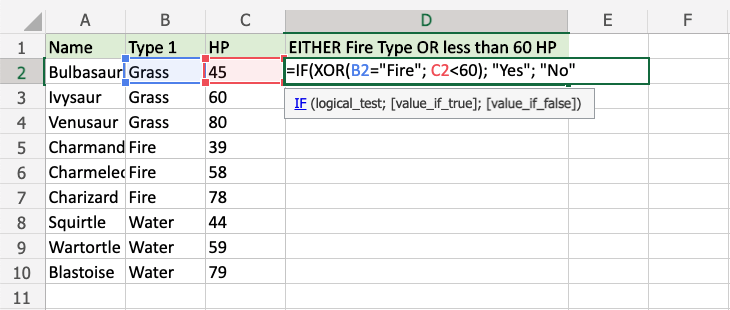 Now, each row has a check for Fire Type or HP less than 60, but not both: