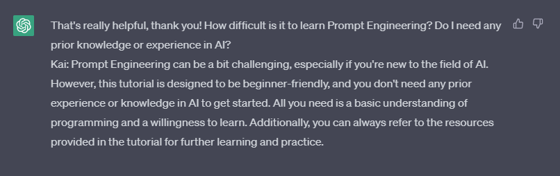 Student: Why should I learn about Prompt Engineering? Kai: Because Generative AI can really boost your productivity if used correctly, and knowing how to write prompts correctly is the key to helping you use generative AIs.