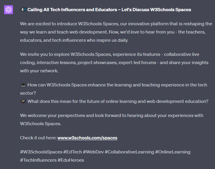 Create a LinkedIn post that asks tech influencers and teachers to discuss "W3Schools Spaces". Include a link to the product.