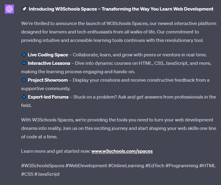 Create a LinkedIn post that announces "W3Schools Spaces" and its key features for people learning to build websites