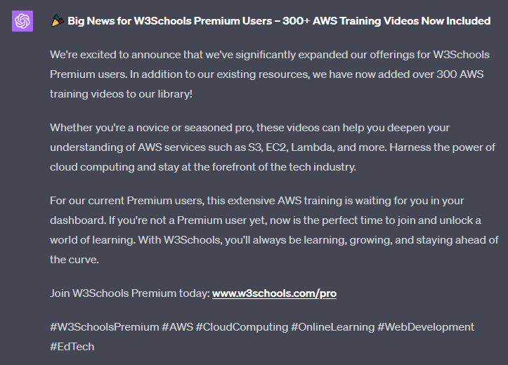 Create a LinkedIn post about how "300+ AWS training videos" are now included for W3Schools Premium users. Include a call to action.