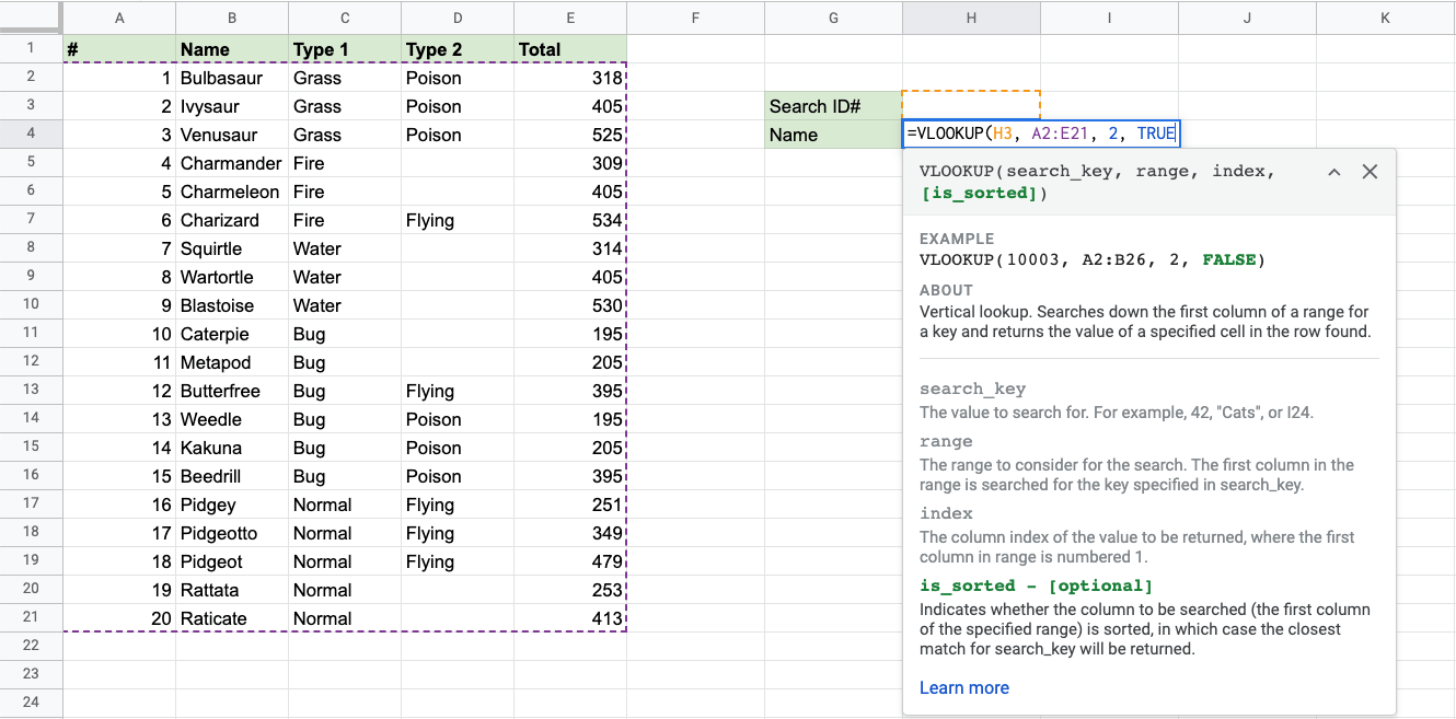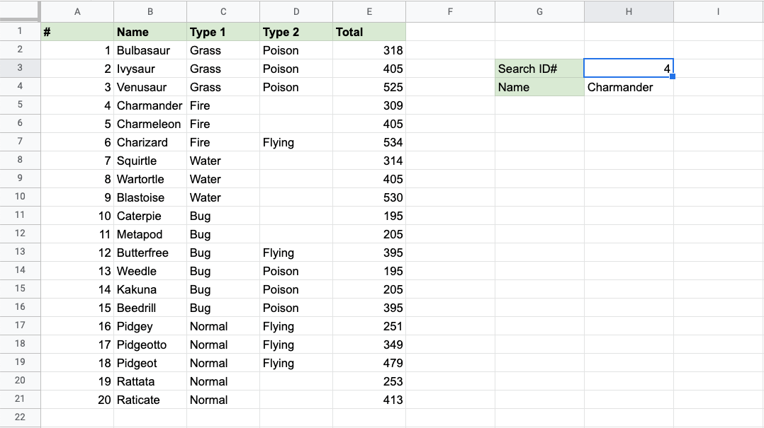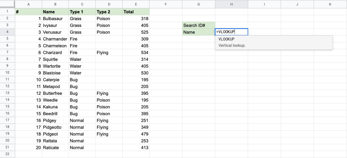 Have a look at that! The VLOOKUP function has successfully found the Pokemon Squirtle which has the ID# 7.