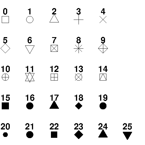 The values of the pch parameter ranges from 0 to 25, which means that we can choose up to 26 different types of point shapes: