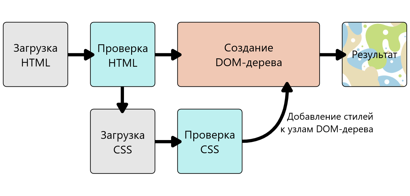 Когда браузер отображает документ, он должен совместить его содержимое с его стилями. Этот процесс идёт в несколько этапов, о которых мы сейчас поговорим. Держите в уме, что это очень упрощённая версия того как браузер действительно загружает веб-страницу, а также то, что разные браузеры делают это по разному. Но, происходит, грубо говоря, следующее: